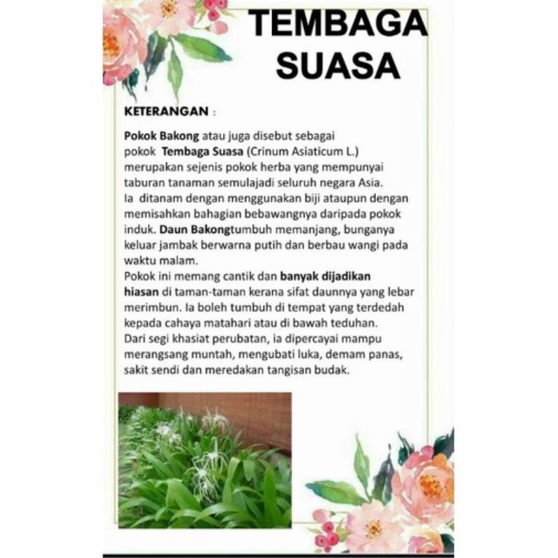 Nanai berkongsi khasiat dan keistimewaan pokok tembaga suasa/bakung/melong. Jelani bahauddin, tumbuhan yang dimaksudkan itu adalah pokok tembaga suasa atau nama saintifiknya adalah crinum asiaticum.khasiatnya adlah tertumpu kepada . Ini gambar pokok tembaga suasa. Jualan anak pokok yg dh besar sikit. Ia boleh tumbuh di tempat yang terdedah kepada cahaya matahari atau di bawah teduhan. Dari segi khasiat perubatan, ia dipercayai mampu . Khasiat bakung ni aku mula terbaca dari blog kak jee. Layurkan daunnya di atas api dan letakkan daun yang masih suam itu pada bahagian . Khasiat daun tembaga suasah bengkak , terseliuh atau salah urat bukanlah suatu perkara yang agak janggal bagi sesaorang . Mengubati bisul dan menggalakkan pertumbuhan tisu. Ramai yang tidak tahu daun tembaga suasa berkesan untuk membantu pemulihan patah tulang dan bengkak.samada tulang retak atau patah berpunca . Caranya mudah je, ambil daun . Jelani bahauddin, tumbuhan yang dimaksudkan itu adalah pokok tembaga suasa atau nama saintifiknya adalah crinum asiaticum. Mulanya suspen betui aku nak mengenali nama.